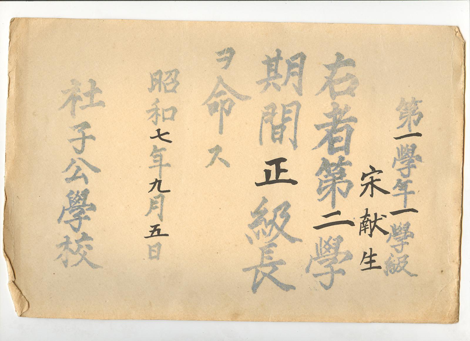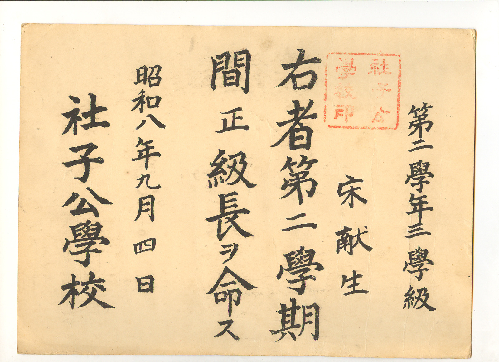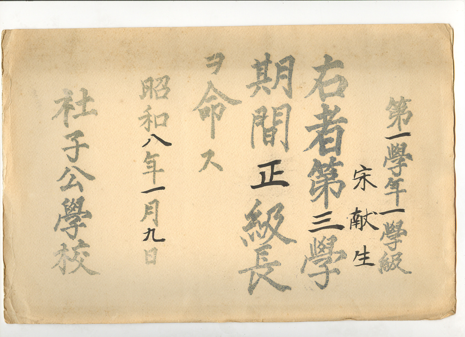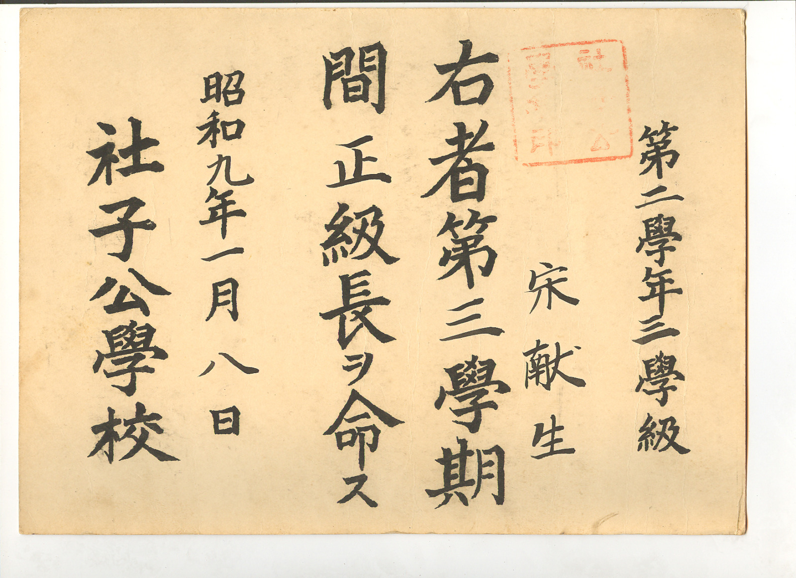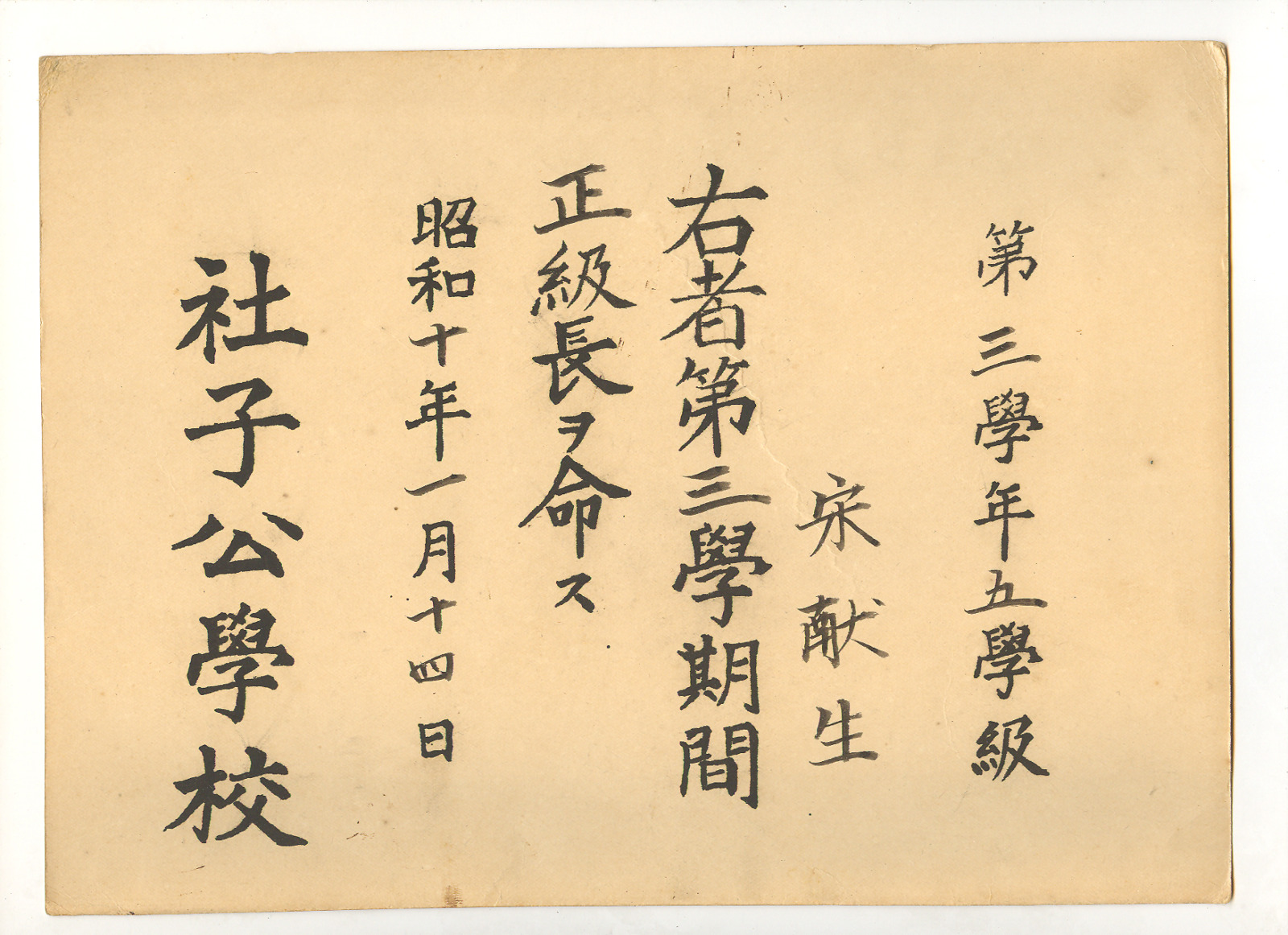 公學校正級長任命狀