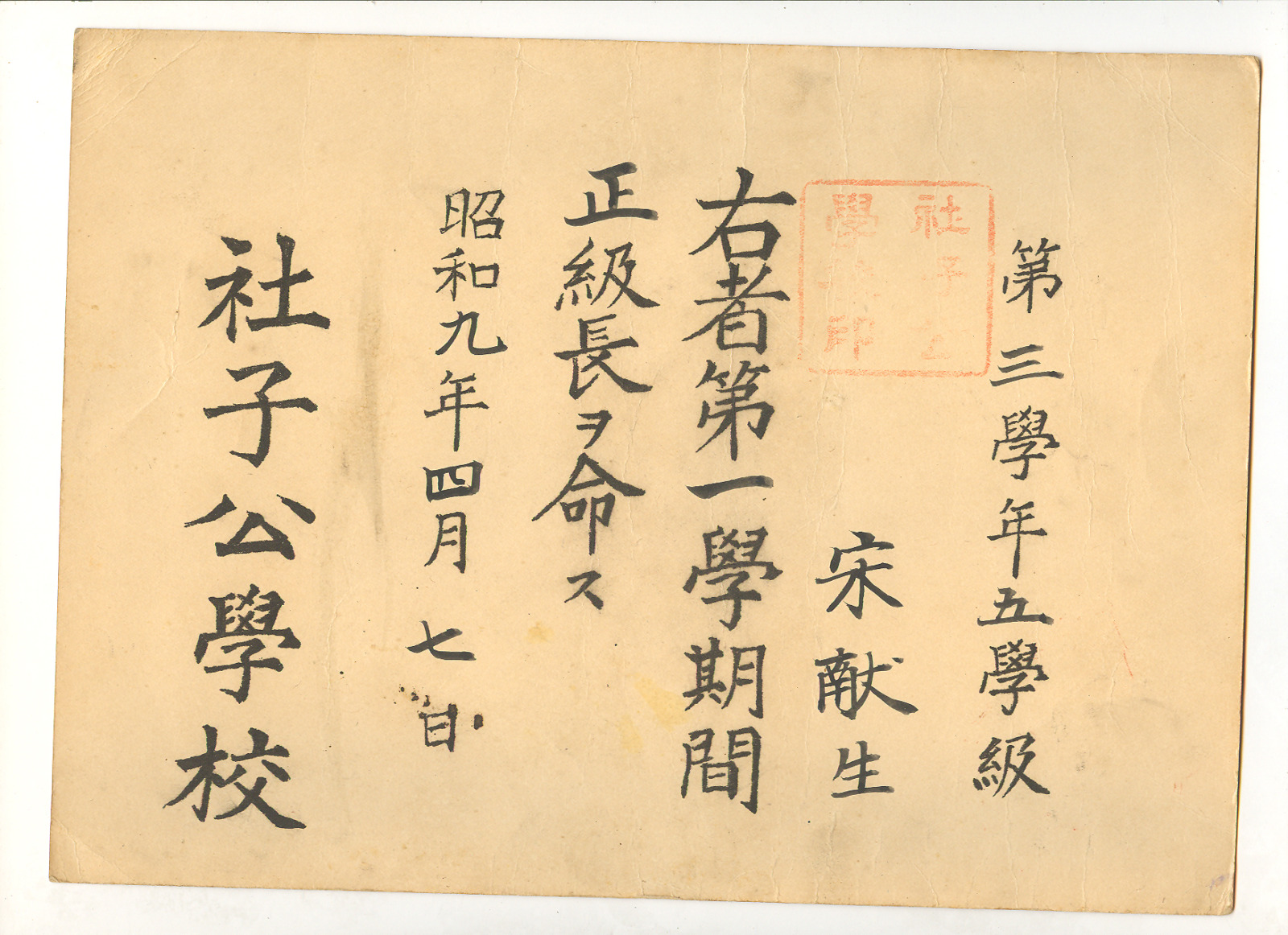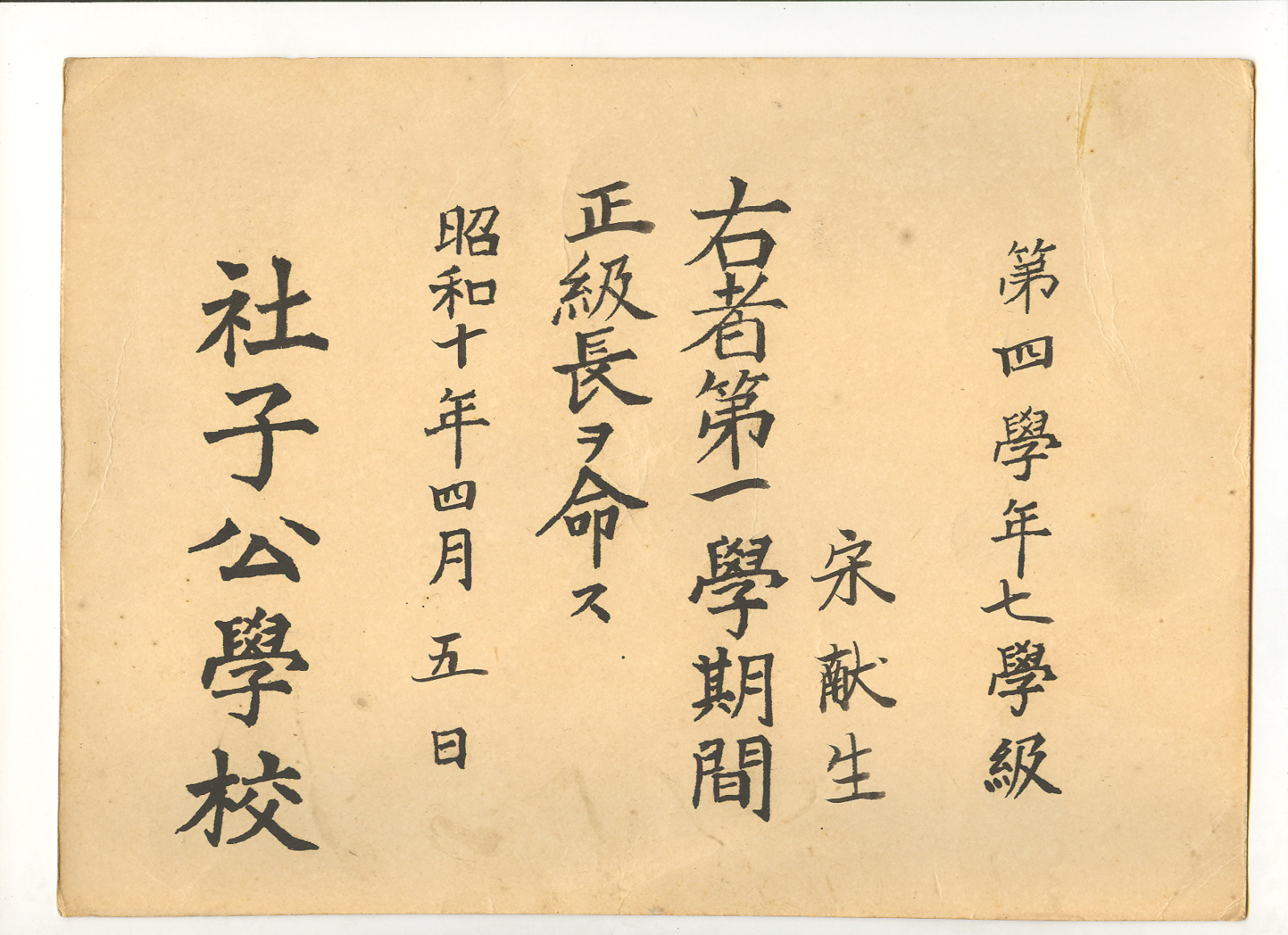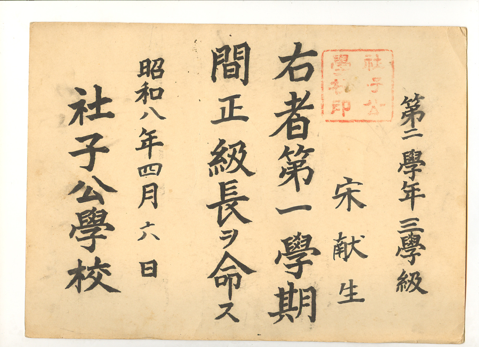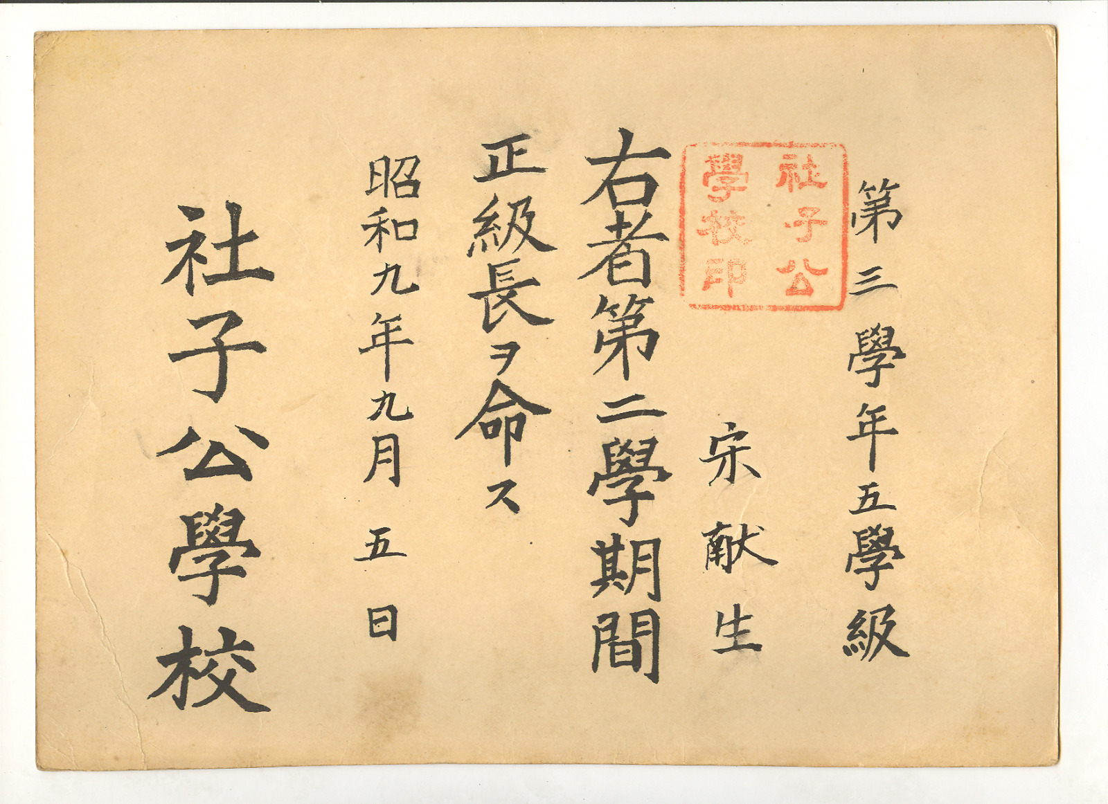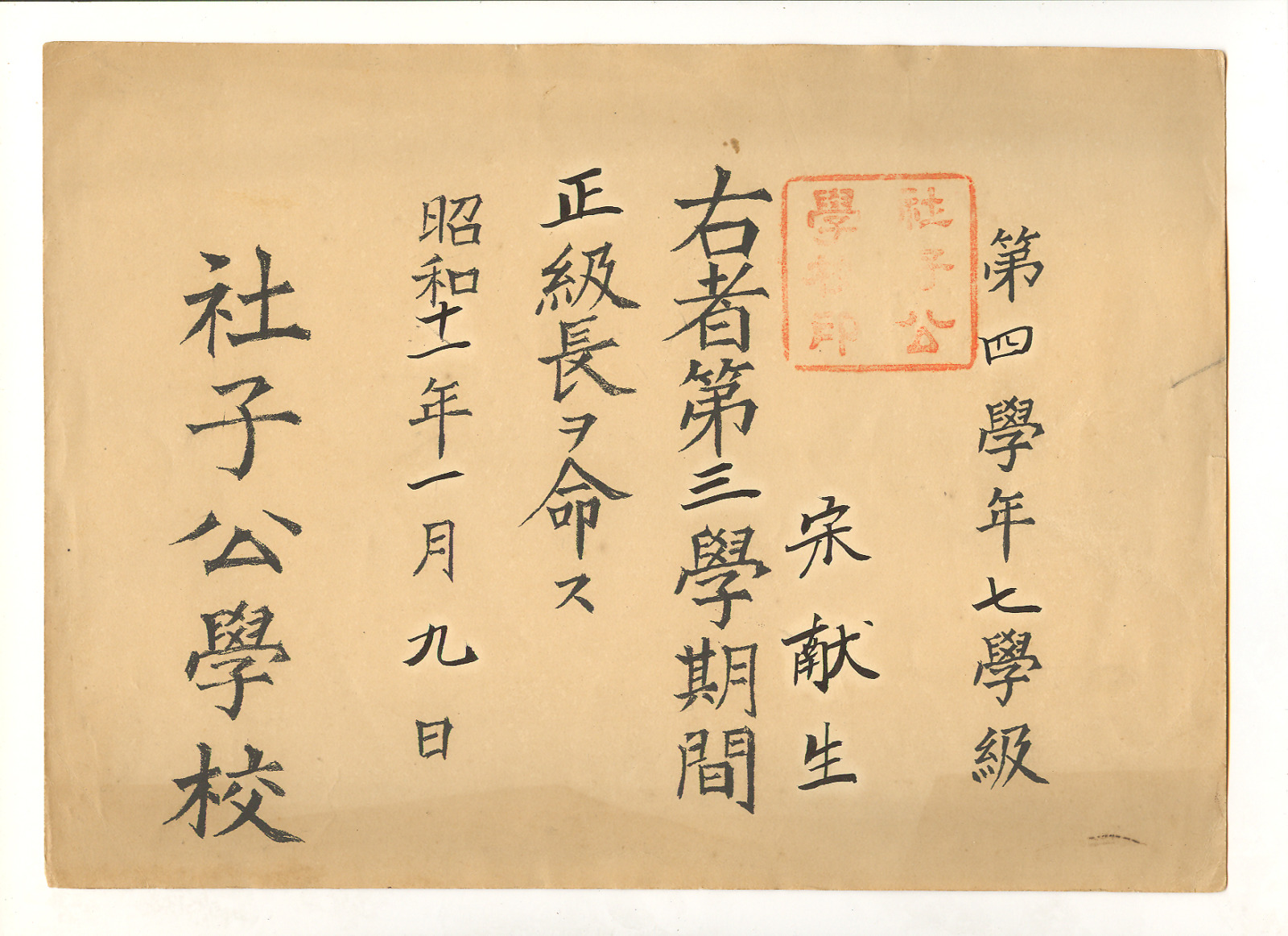 公學校正級長任命狀