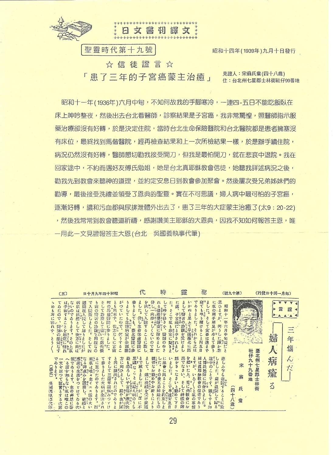 我們家之所以是基督徒,原來是因為阿公的關係。12歲時罹患當時醫療束手無策的肺結核,病危時家族家人們紛紛回老家,準備看最後一面。姑姑宋翁鴦早些年因為子宮癌因信主治癒成為真耶穌教會信徒,替奄奄一息的阿公禱告,禱告後就有起色;隔天又繼續探訪代禱,就這樣漸漸地康復了。