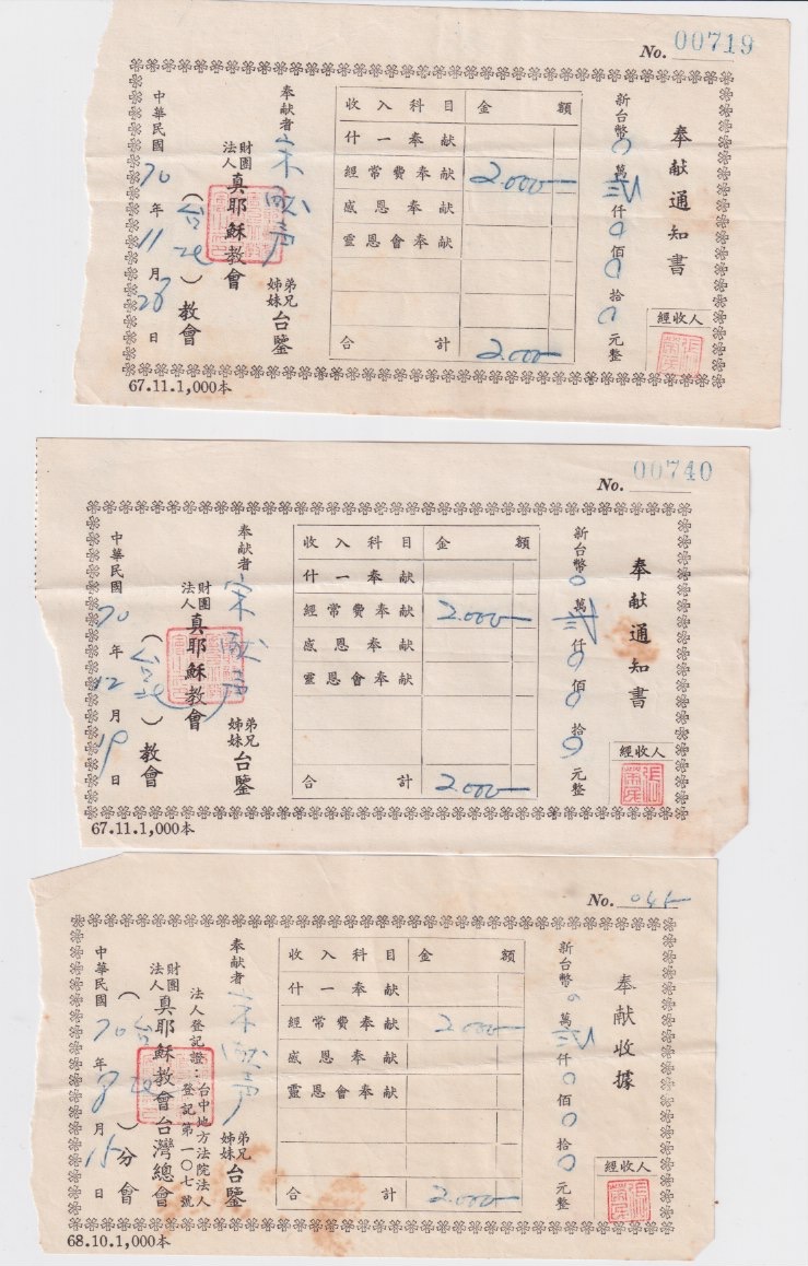 基督信仰對我們家的影響,可謂相當深遠;家人信仰不走狂熱路線,有時候會展現一種,對教會感到厭煩,但不影響精神上順服基督的態度。阿公也和我提過類似觀點。他說,教會是在斂財的,要敬拜神,在家禱告就好了。下圖是整理文件發現,阿公『被斂財』的收據