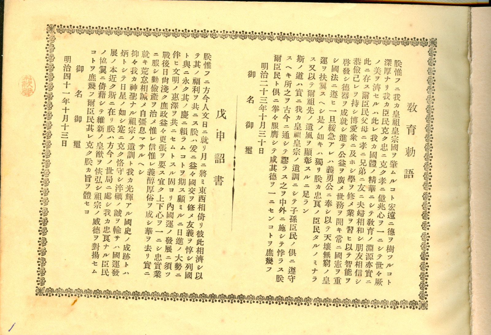 - 1890年,日本明治天皇頒布《教育敕語》,一直延續到1945年。當時日本政府規定,每個教室里要懸掛「御真影」,即懸掛明治天皇照片,教師和學生每天清晨拜天皇照片,並背誦《教育敕語》。