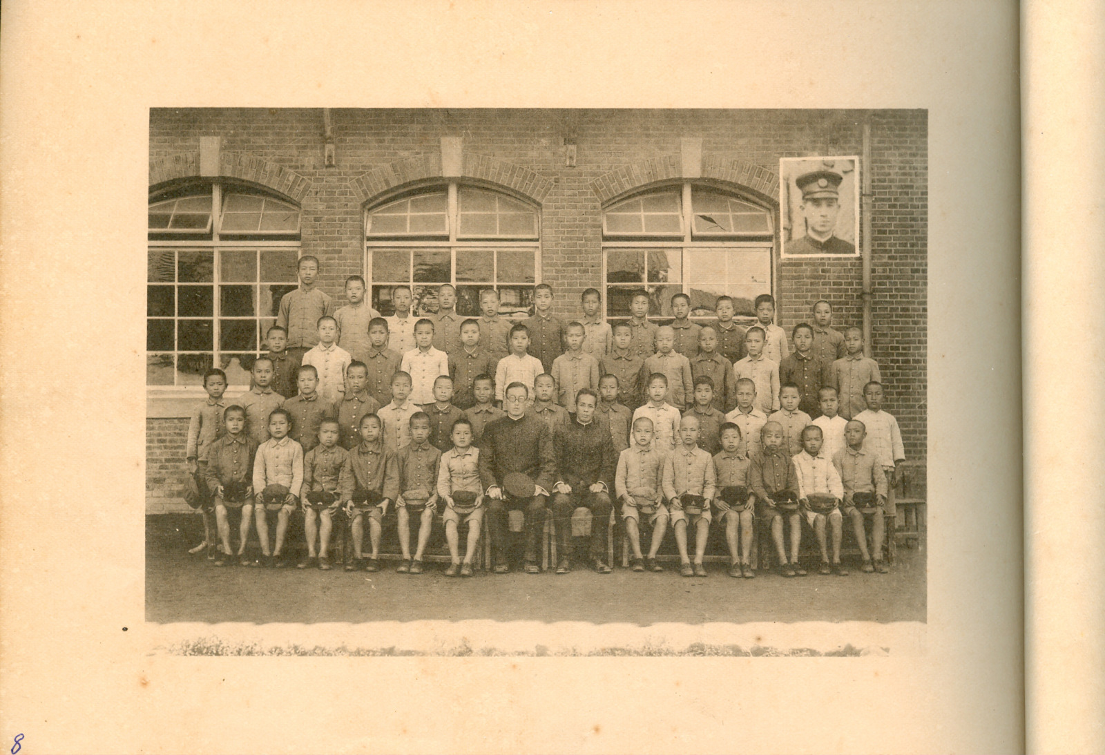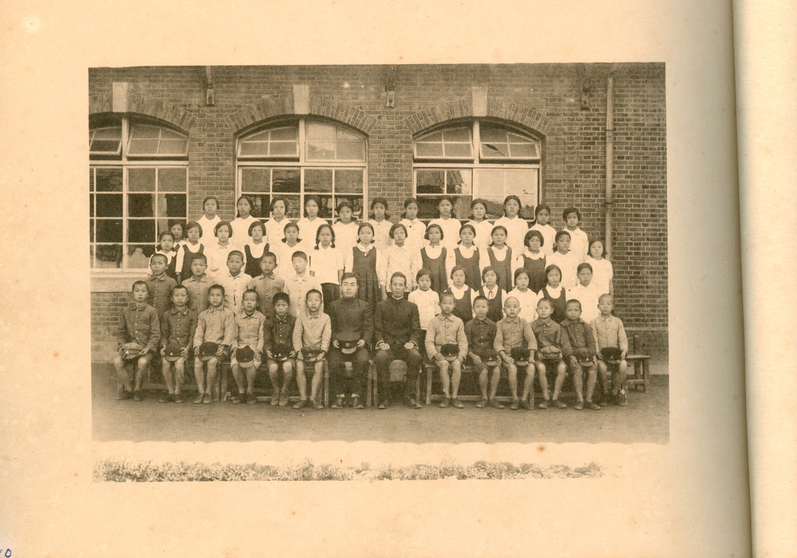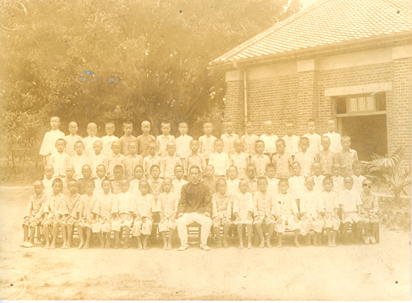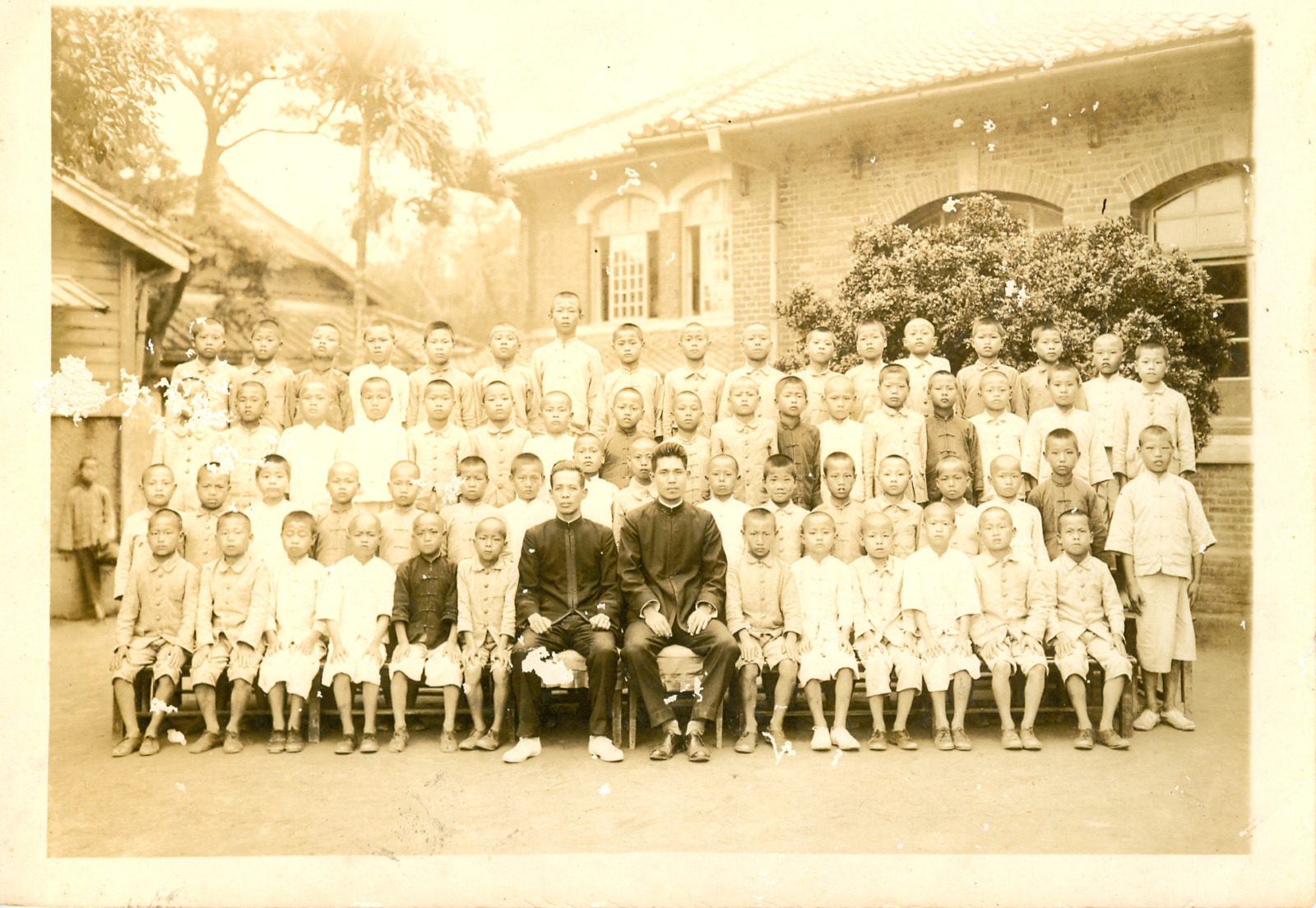 拍照處看起來是學生教室外面,第一排坐在長板凳上。氣窗有圓弧狀可以外翻,別緻。有氣窗玻璃破了,還沒補。學生穿長袖、短褲、包鞋。衣服造型基本一致,但顏色看來有三、四種,原因不明。很多孩子的衣服是皺的,但阿公穿得又白又亮又挺,反映出是個有錢人的孩子。