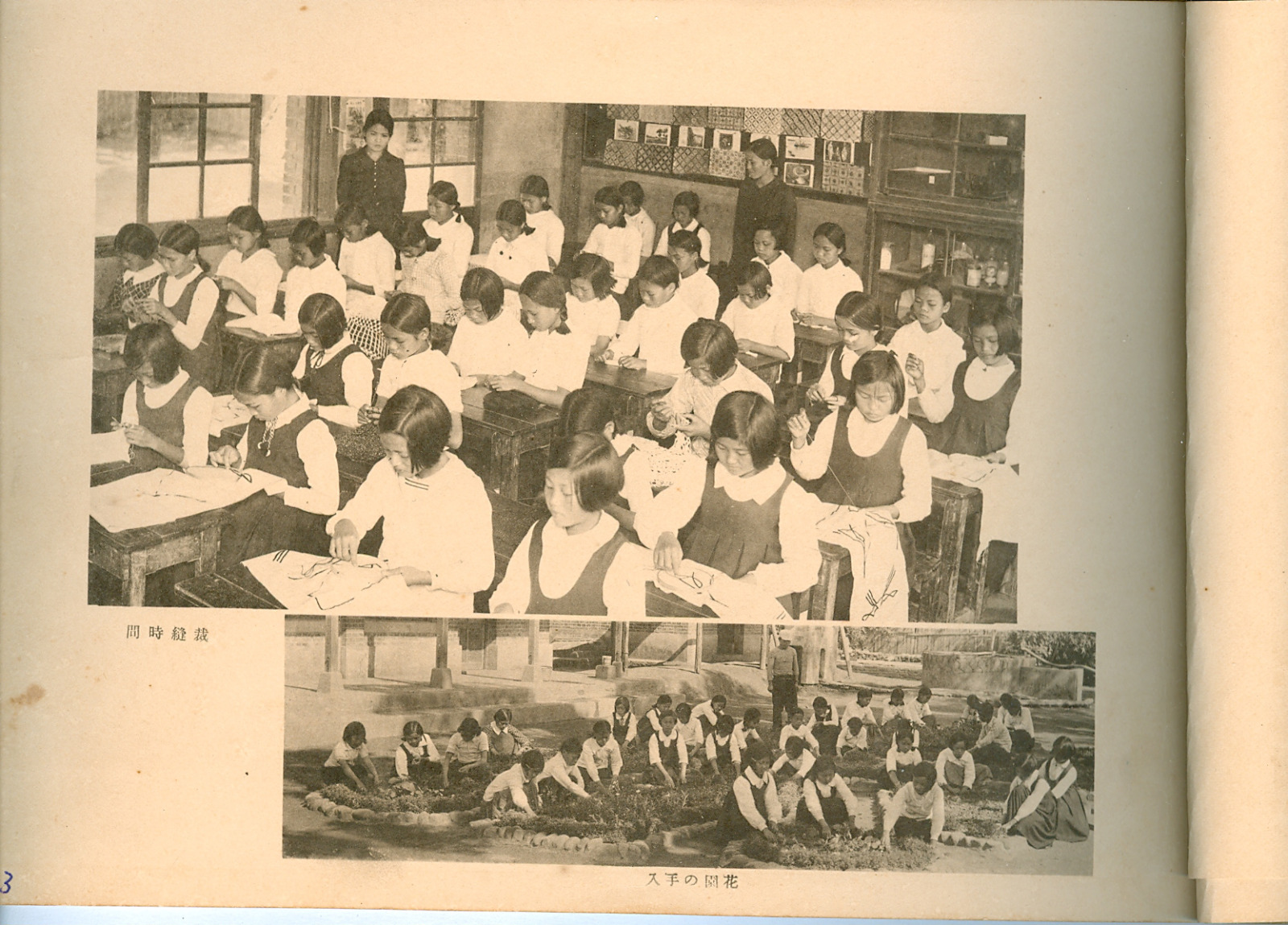 裁縫課,我國小時也上過縫東西。教室好乾淨,連個書包都看不到。不知道當時學生書包什麼樣子。種花的場域,看起來是校內。